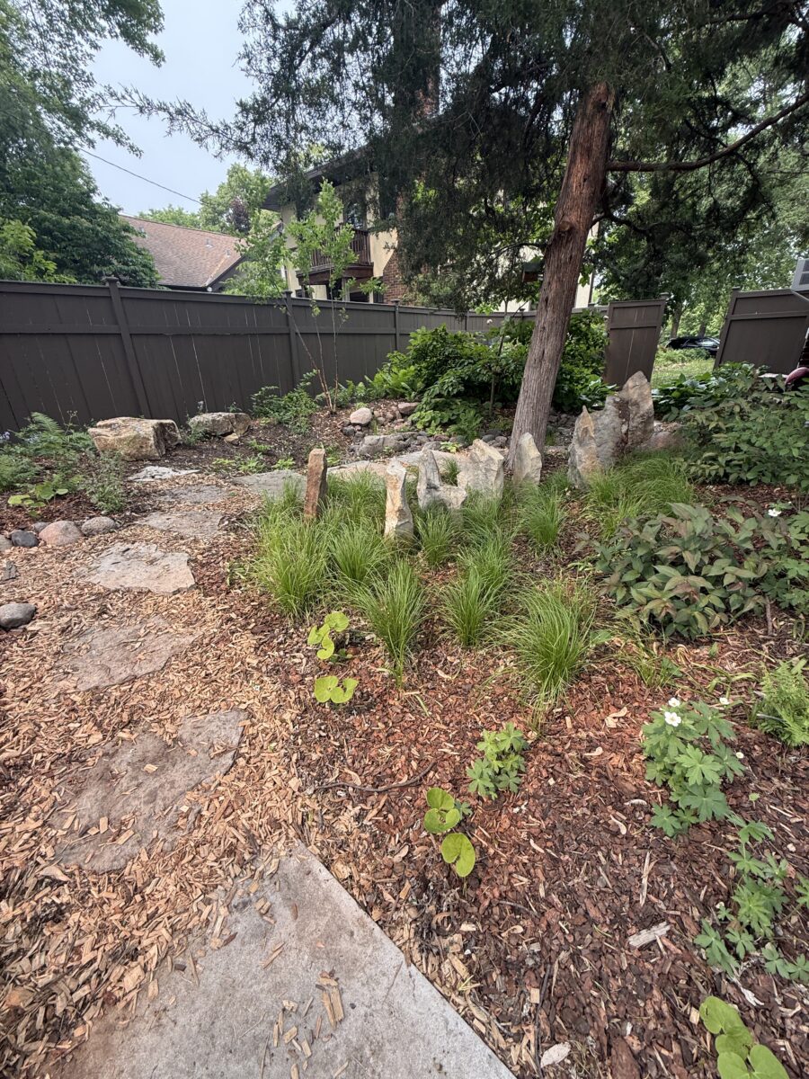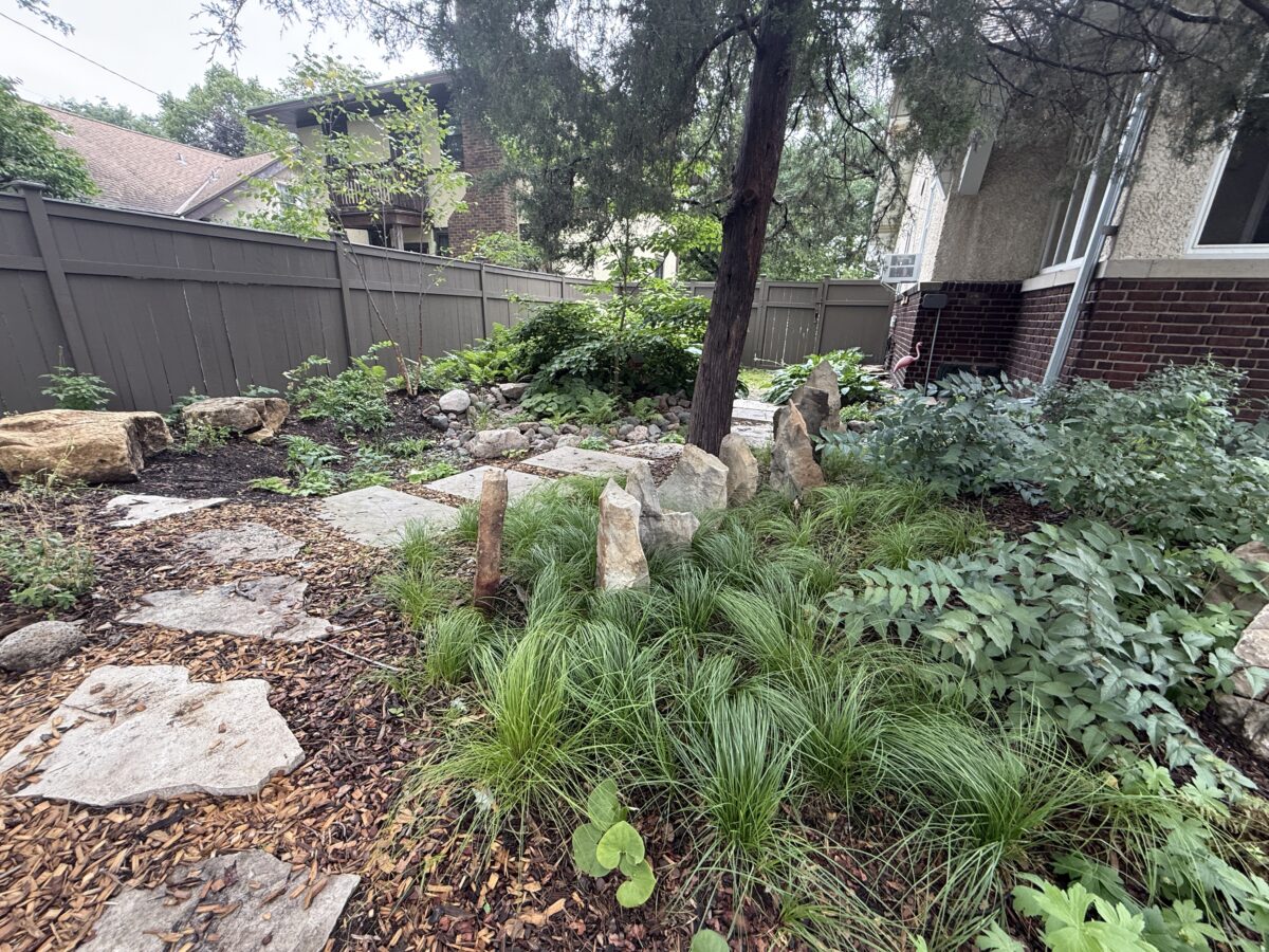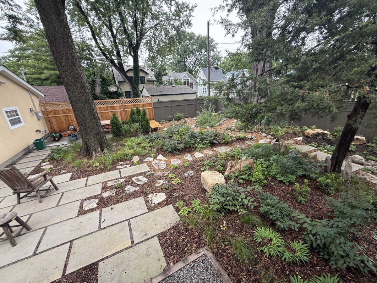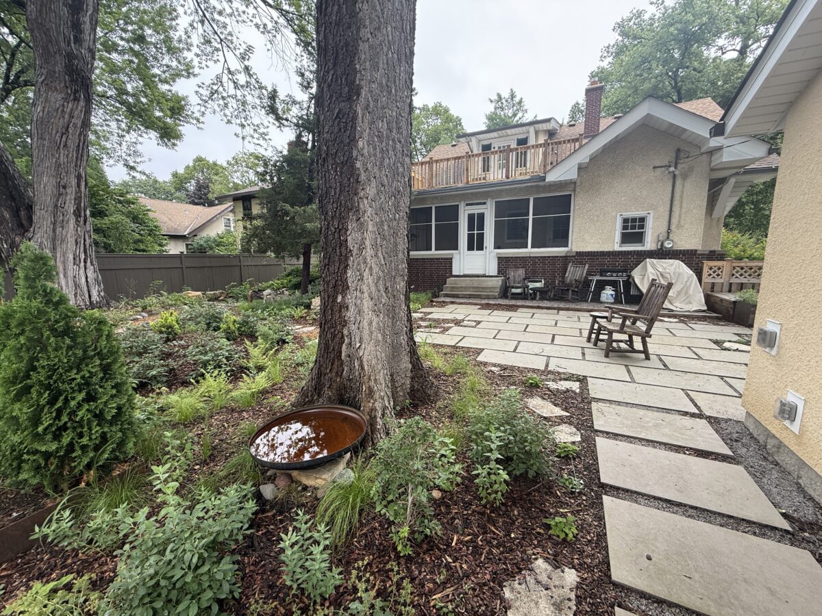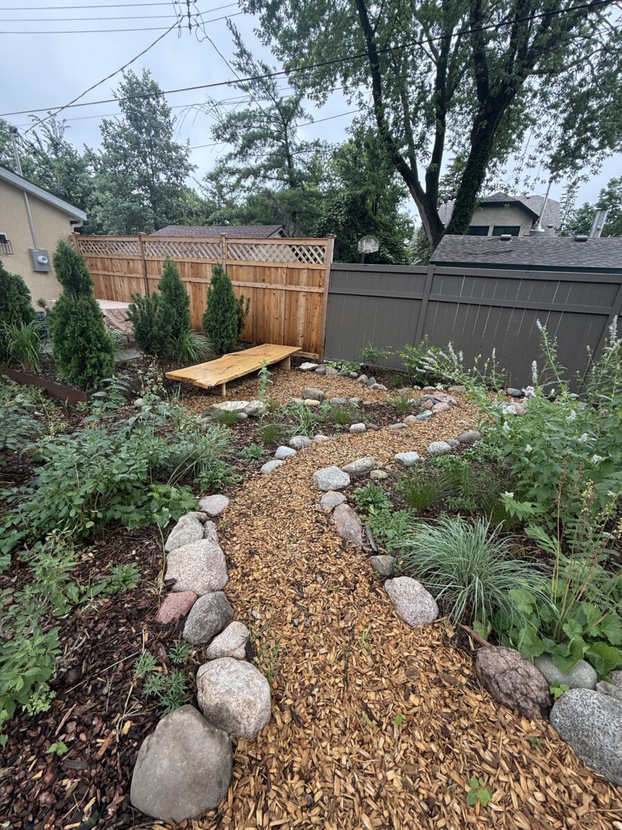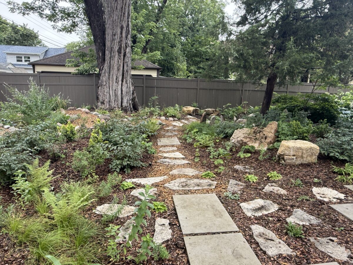 This backyard design, located on the Mississippi River Road, brings a modern touch to the property’s existing cottage gardens. Carefully curated plantings create a harmonious series of spaces while taking on the variable light conditions throughout the site. A rustic path, which meanders through the lush woodland groundcovers and vibrant sun-loving prairie, leads to a generous patio and smaller nooks with custom seating benches offering opportunities for gathering and forest bathing among the plants and visiting wildlife.