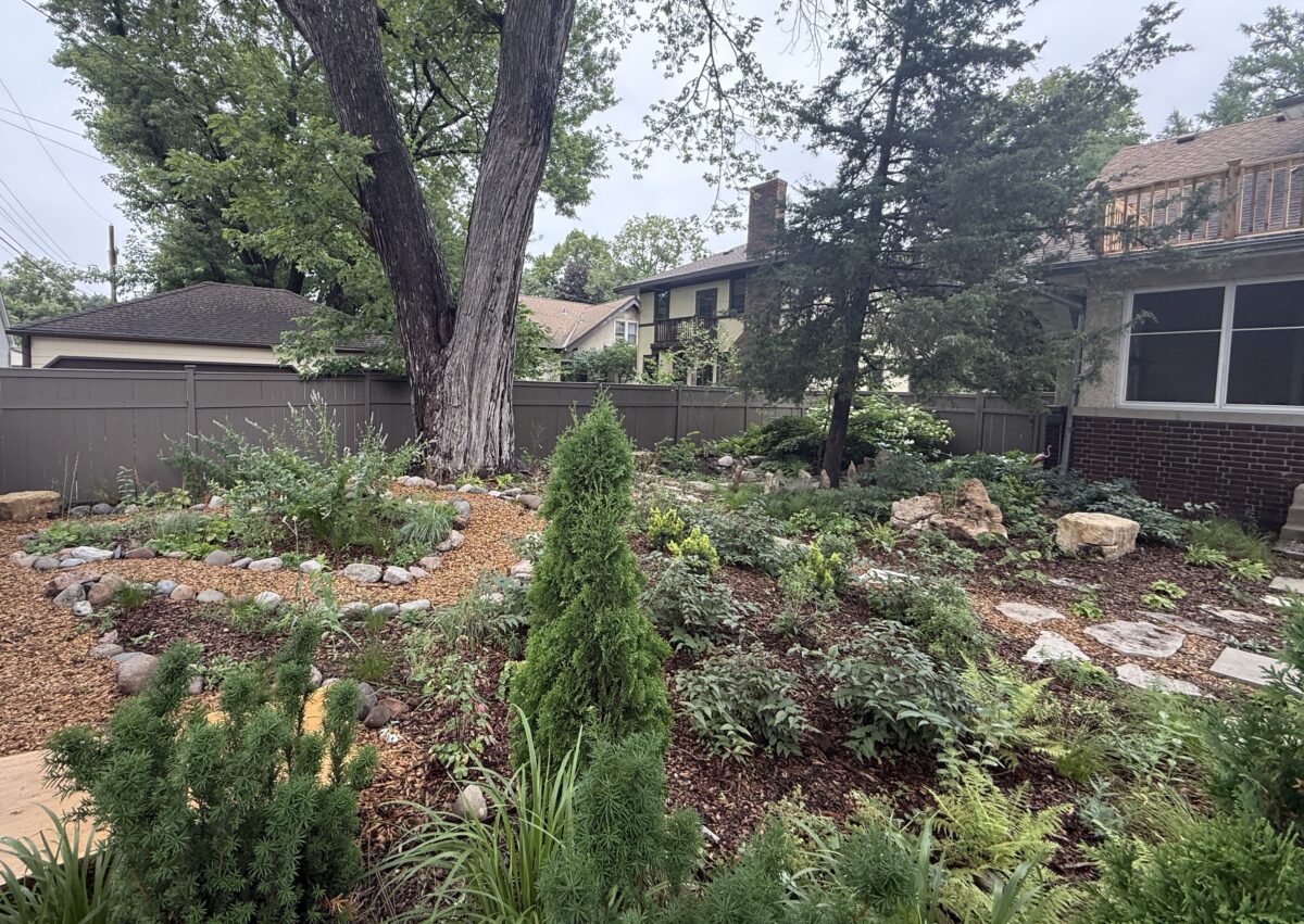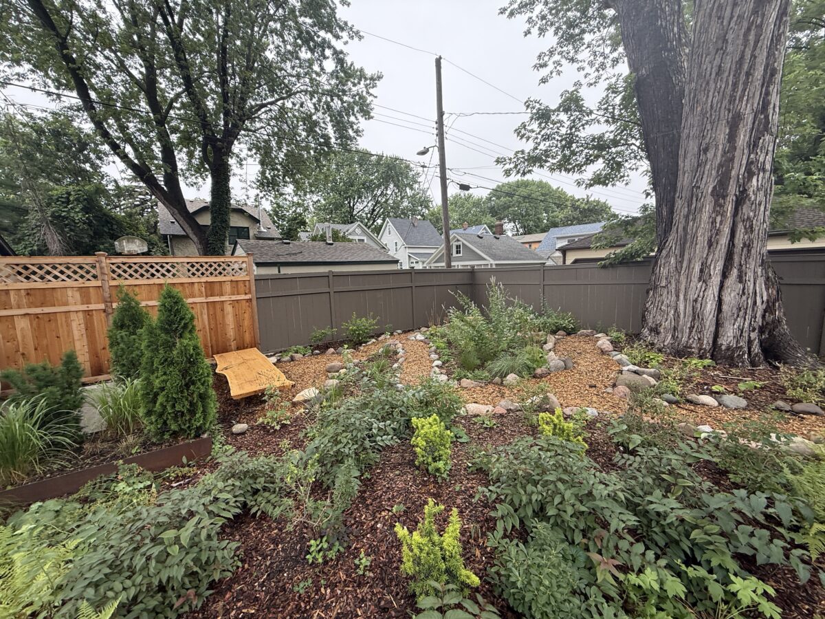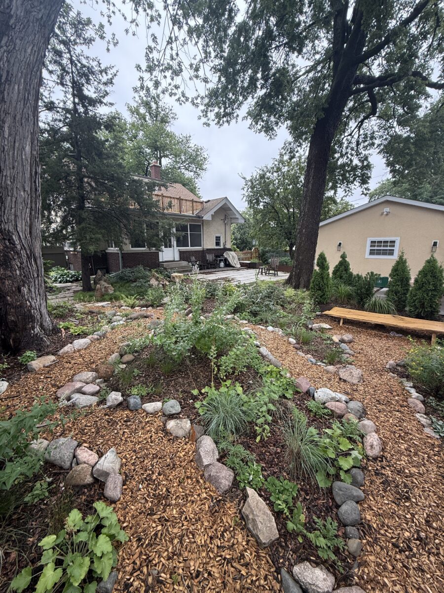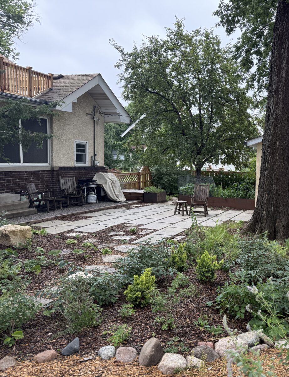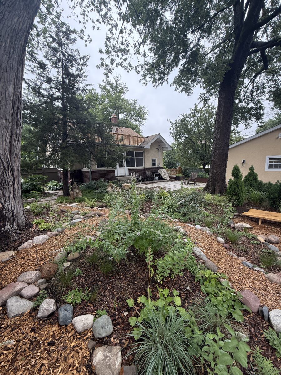 This backyard design, located on the Mississippi River Road, brings a modern touch to the property’s existing cottage gardens. Carefully curated plantings create a harmonious series of spaces while taking on the variable light conditions throughout the site. A rustic path, which meanders through the lush woodland groundcovers and vibrant sun-loving prairie, leads to a generous patio and smaller nooks with custom seating benches offering opportunities for gathering and forest bathing among the plants and visiting wildlife.
