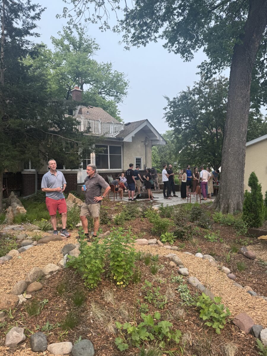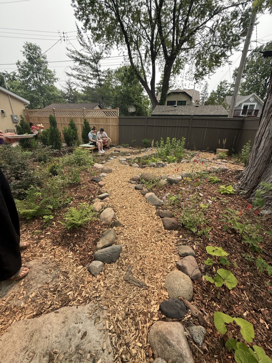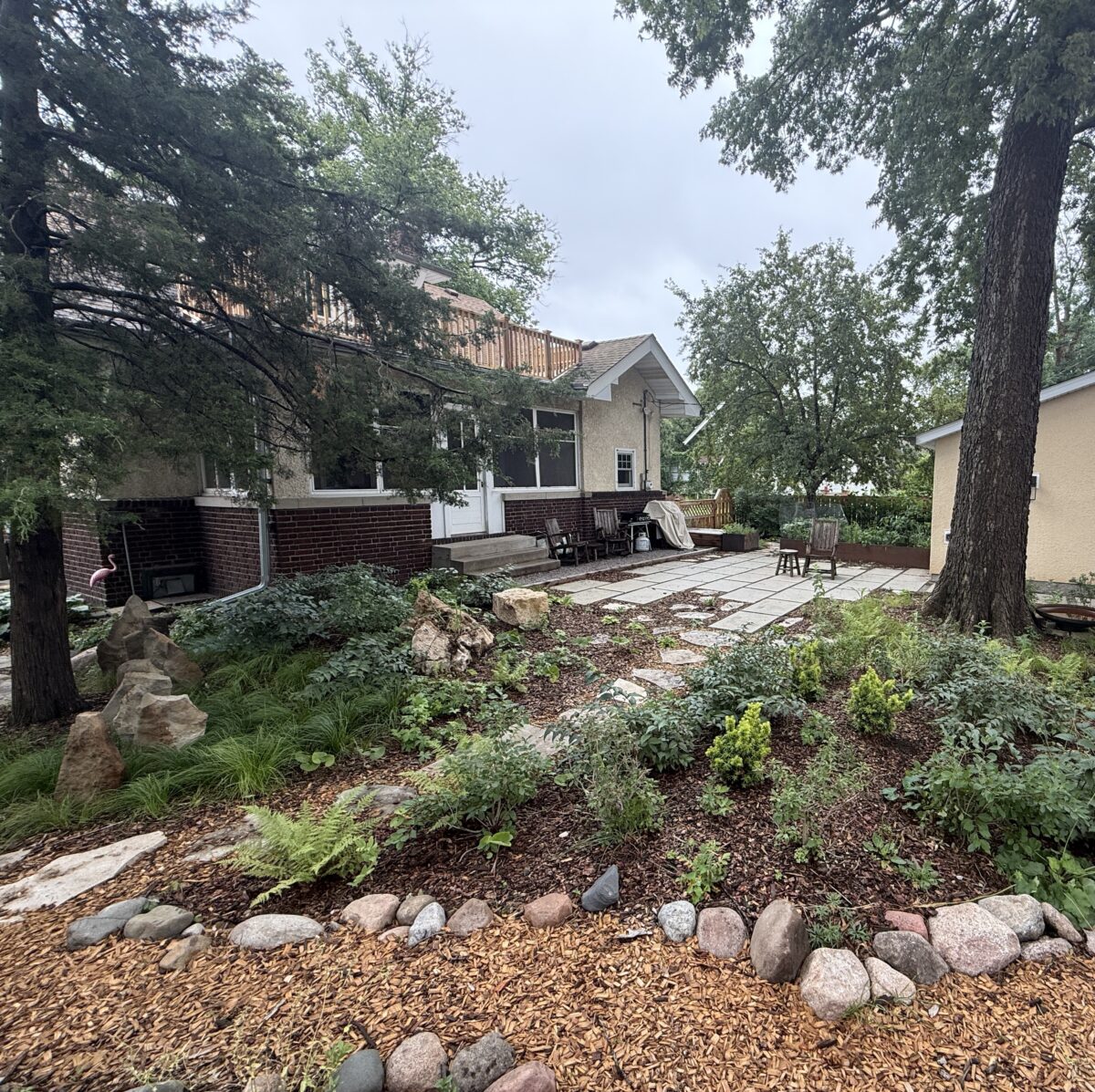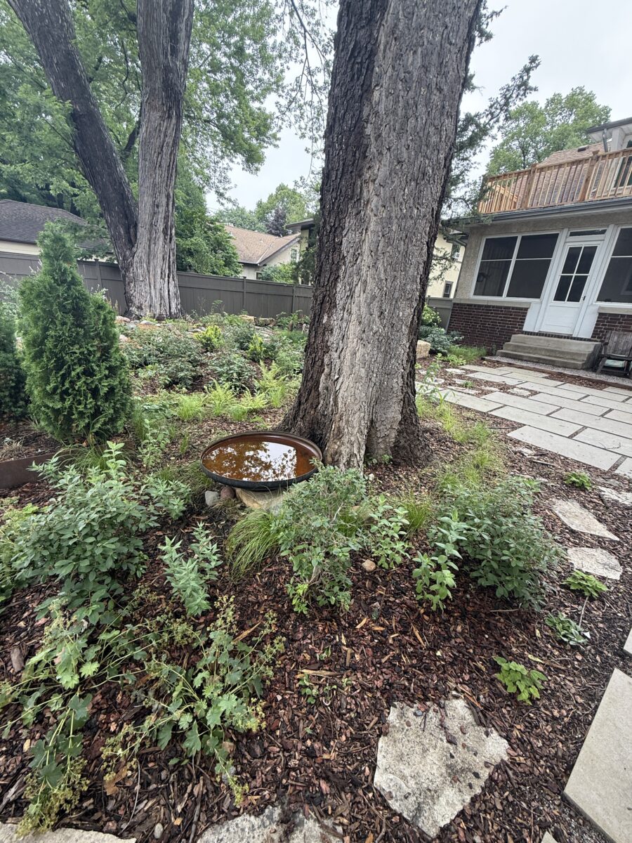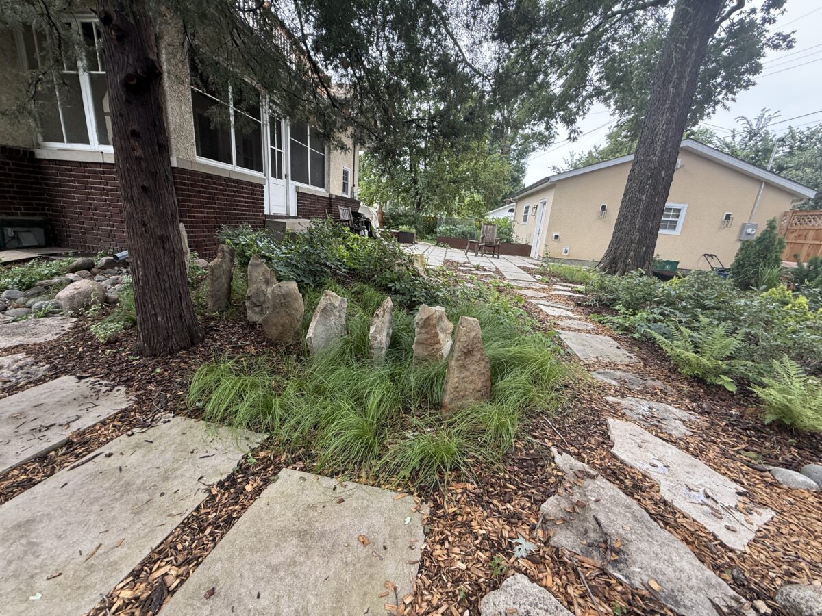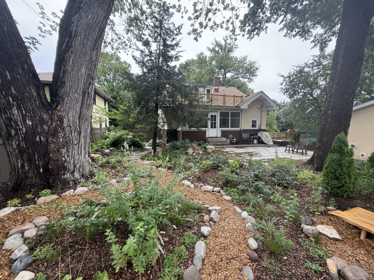 This backyard design, located on the Mississippi River Road, brings a modern touch to the property’s existing cottage gardens. Carefully curated plantings create a harmonious series of spaces while taking on the variable light conditions throughout the site. A rustic path, which meanders through the lush woodland groundcovers and vibrant sun-loving prairie, leads to a generous patio and smaller nooks with custom seating benches offering opportunities for gathering and forest bathing among the plants and visiting wildlife.