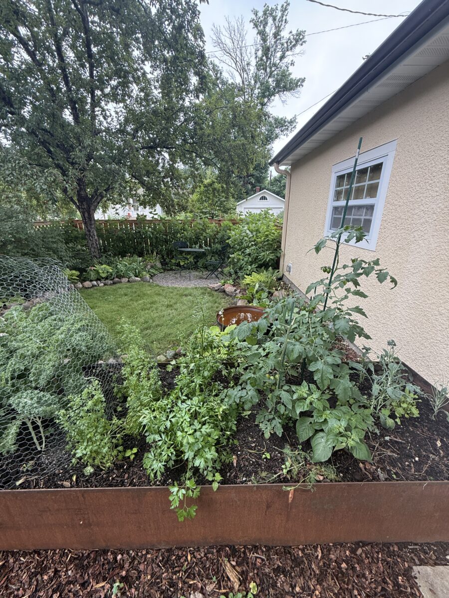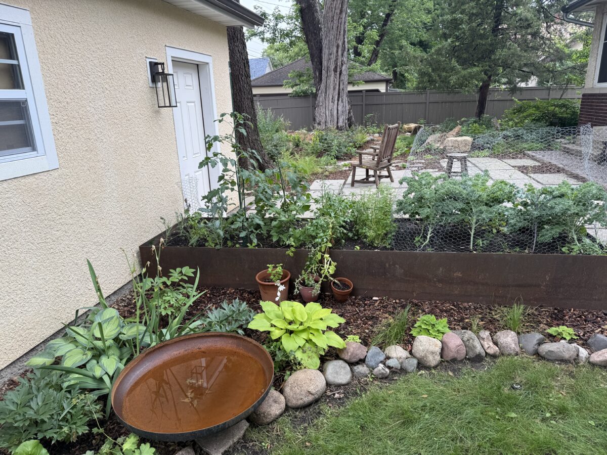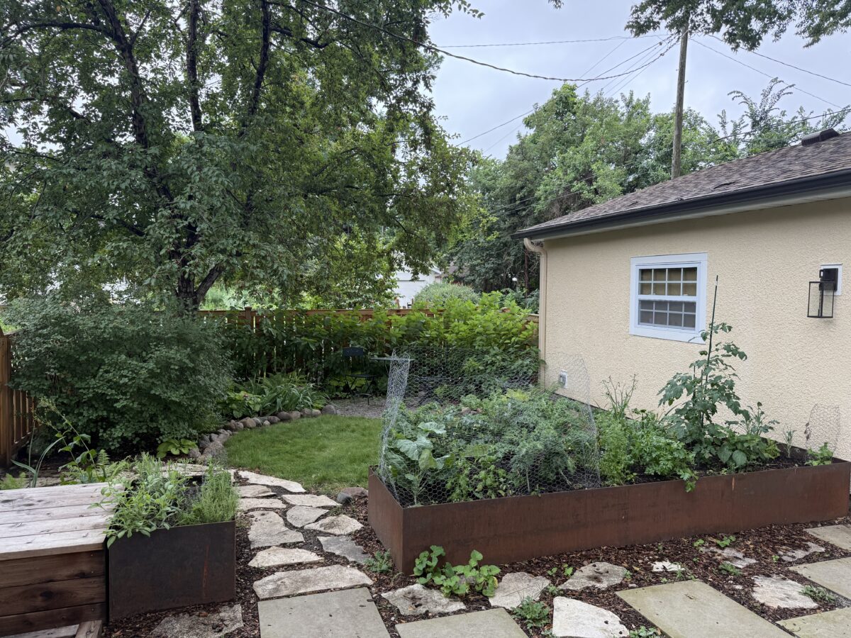 Raised metal planting beds provide space for herbs, peppers and other annual gardening. A crushed gravel “tea nook” and “picnic lawn” are nestled into the deep plantings, providing space to relax among the flowers.