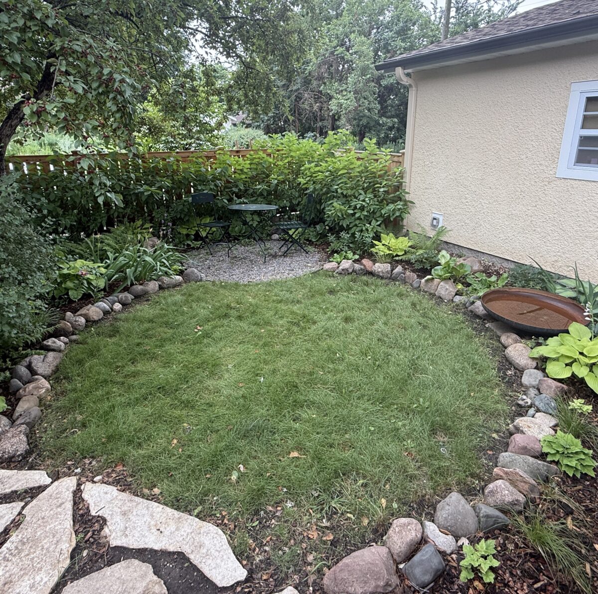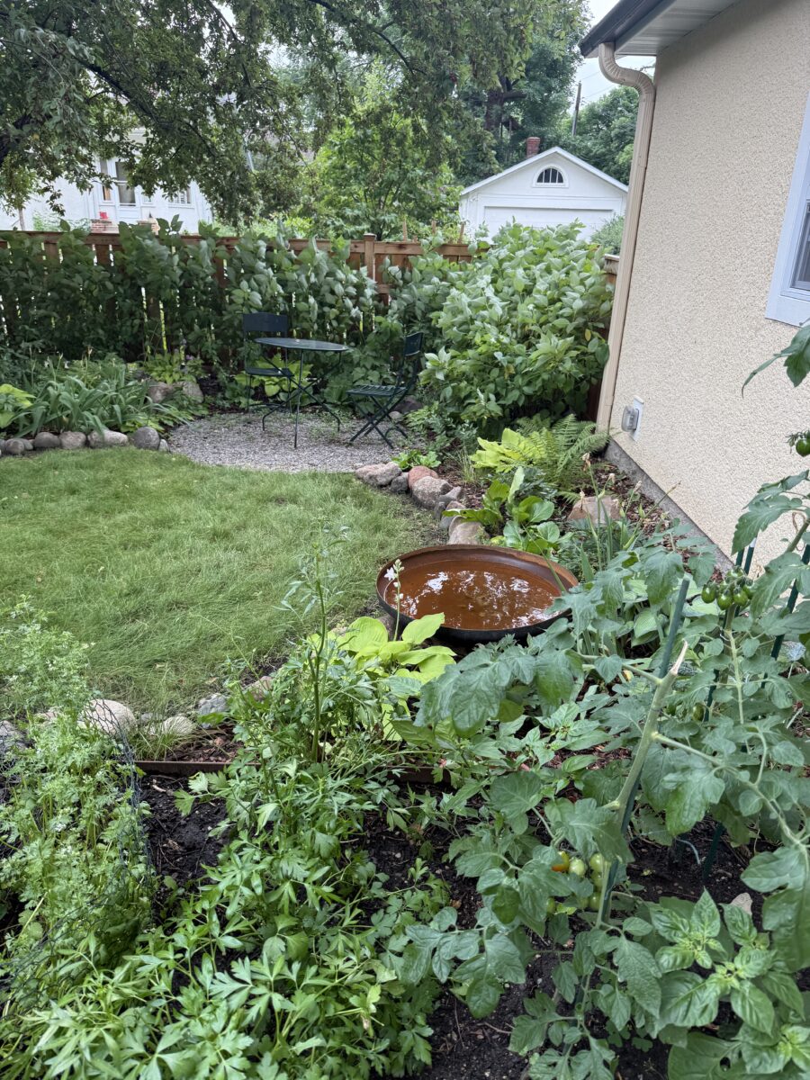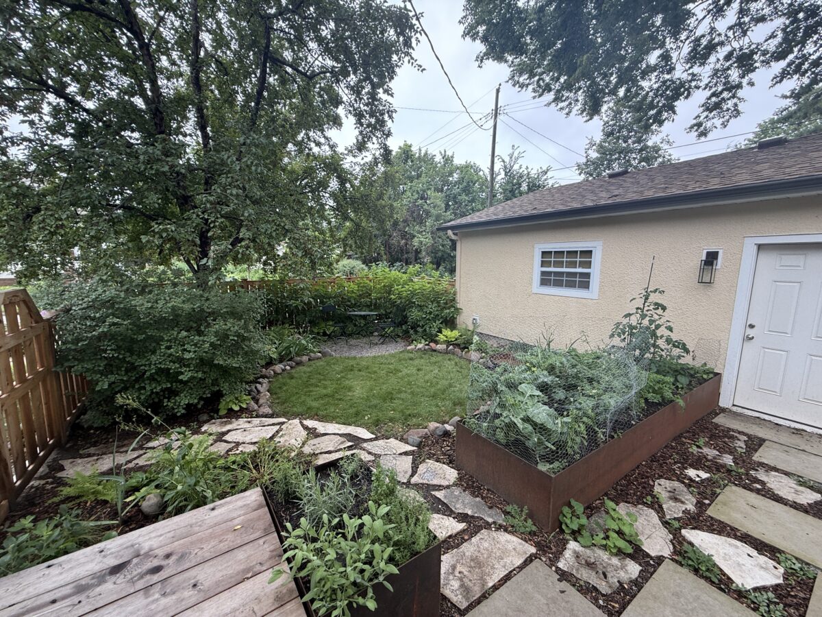 Raised metal planting beds provide space for herbs, peppers and other annual gardening. A crushed gravel “tea nook” and “picnic lawn” are nestled into the deep plantings, providing space to relax among the flowers.
